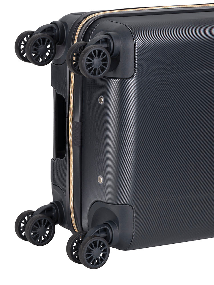 Make the most of every memorable moment of your journey with this delightfully appealing 4-wheel Carry On Trolley Case which offers convenient top and side carry handles and 4 double glider wheels. The interior is beautifully enhanced with a vibrant red lining and elastic tie-down straps. The Jo Borkett Nouveau luggage Collection features Art Deco-inspired luggage with a modern twist. Available in Twilight Blue, Merlot and Deep Slate with soft gold hardware, this range has been designed to create a sleek and timeless elegance that symbolizes class and sophistication.