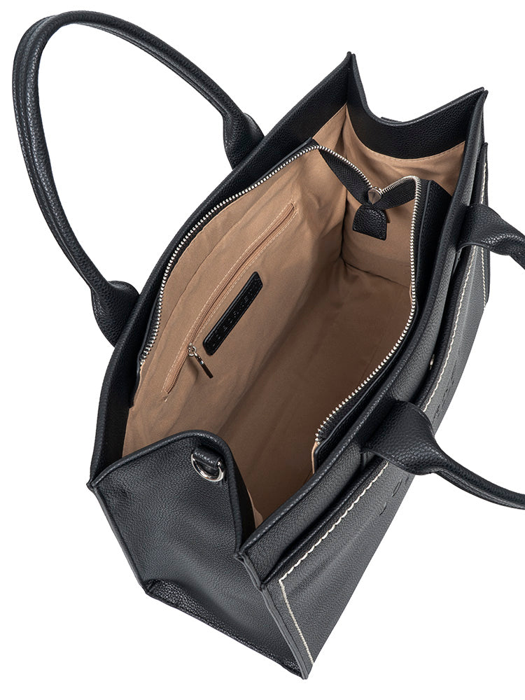 This stunning Shopper is designed for the sophisticated modern woman who looks stylish wherever she goes. Carry this ideal everyday accessory using either the top carry handles or the adjustable broad shoulder strap. The main compartment with zip closure safely stores all the daily essentials in the spacious interior which features a nude inner lining fitted with zip and slip pockets to keep everything in place. There is also an outer zipped pocket at the back for easy access. The Jo Borkett Skye Shopper is available in Taupe and Black and perfectly finished with an embossed Jo Borkett logo, detailed stitching and silver hardware.