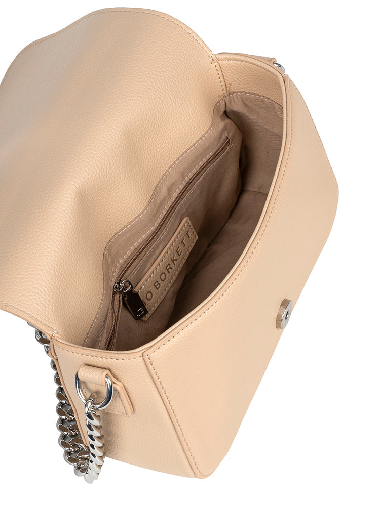 The fashionable and fabulous Flapover Sling is the perfect way to elevate your impeccable sense of style to a new level. Enjoy the versatility of using either the broad adjustable shoulder strap or the chain handle which perfectly showcases this eye-catching accessory. Keep all essential items organised in the main zipped compartment which opens to reveal a neutral interior lining fitted with zip and slip pockets. The Jo Borkett Skye Flapover Bag is available in Black, Taupe and Red with a bold embossed Jo Borkett logo and exquisitely framed with stitching detail and silver hardware for an irresistible look.