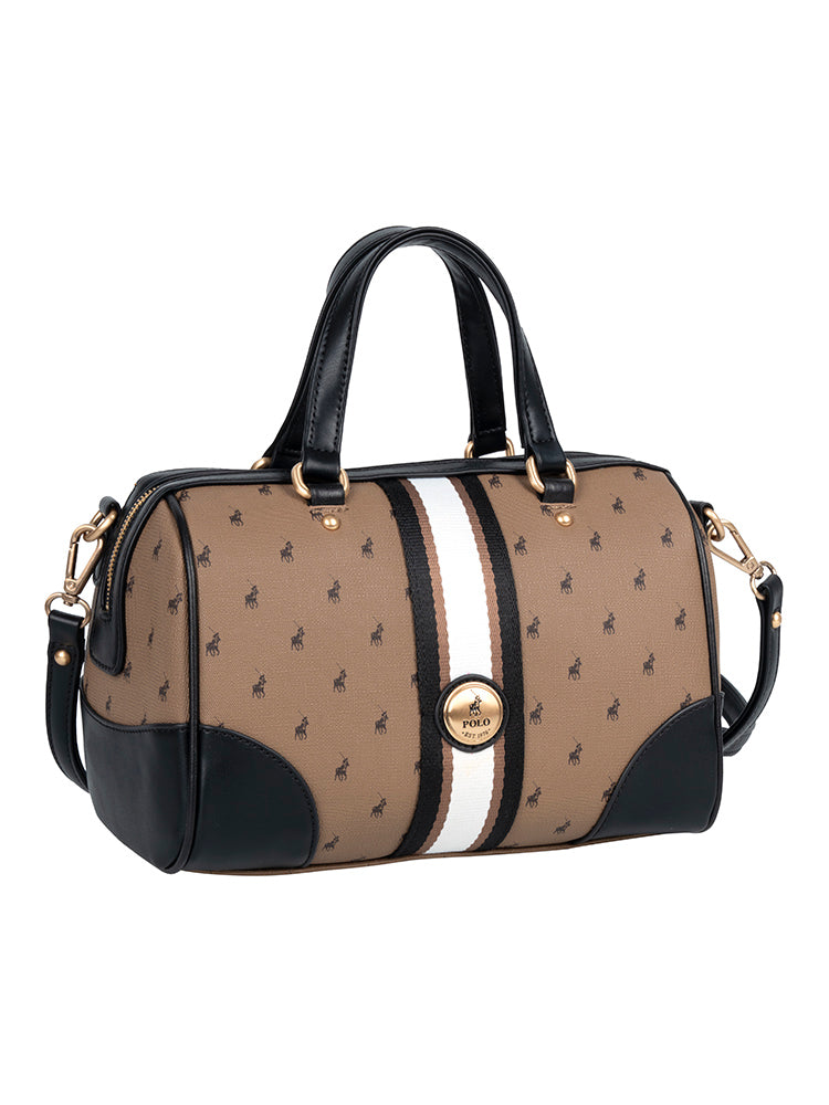 Strike a stylish pose with the classic Medium Barrel Bag as your accessory of choice. The main zipped compartment will safely keep all essentials in place in the interior organiser. There are two top carry handles or a detachable, adjustable shoulder strap to cater to all tastes. The Polo Oxford collection is available in Camel and Grey featuring the distinctive pony print background enhanced with a contrasting colour stripe down the centre - the Camel background has a bold white stripe and is framed with black accents, while the Grey background has a Burgundy stripe and accents and soft gold hardware to add a sporty element to the collection.