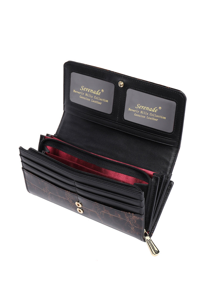 This Serenade Leopard Large Patent Leather Purse has plenty of room for all your cards and essentials. Large enough to fit 20 cards plus 2 window identification slots and additional compartments for notes.